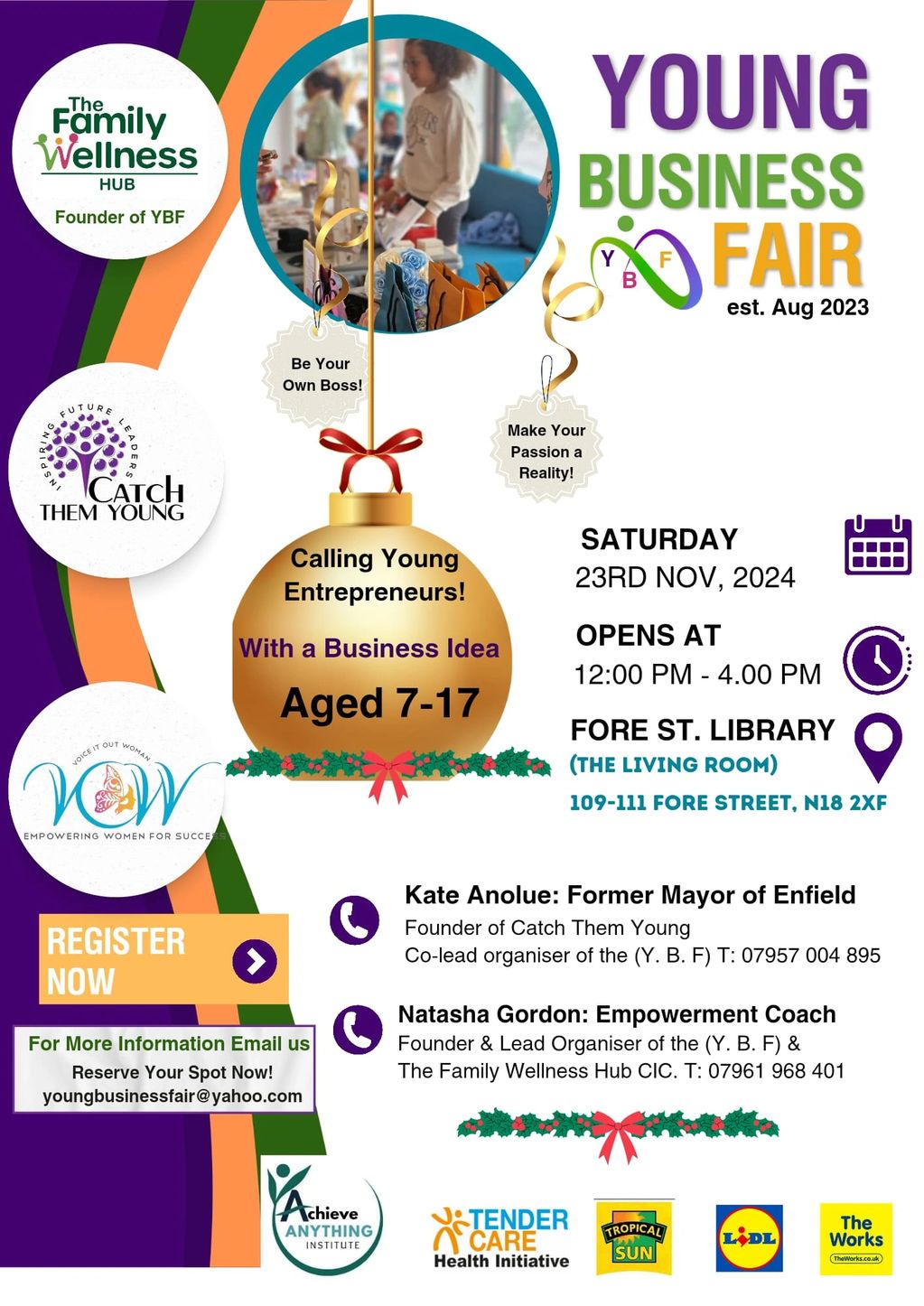 We are calling all youth entrepreneurs!!! If you're aged 7-17 with a business idea or talent, join us on 23rd November, 2024 at Fore Street Library for an exciting day filled with opportunities! Free stands for young entrepreneurs and a chance to showcase your talents (songs, poems, dance) await. This is your moment to shine!